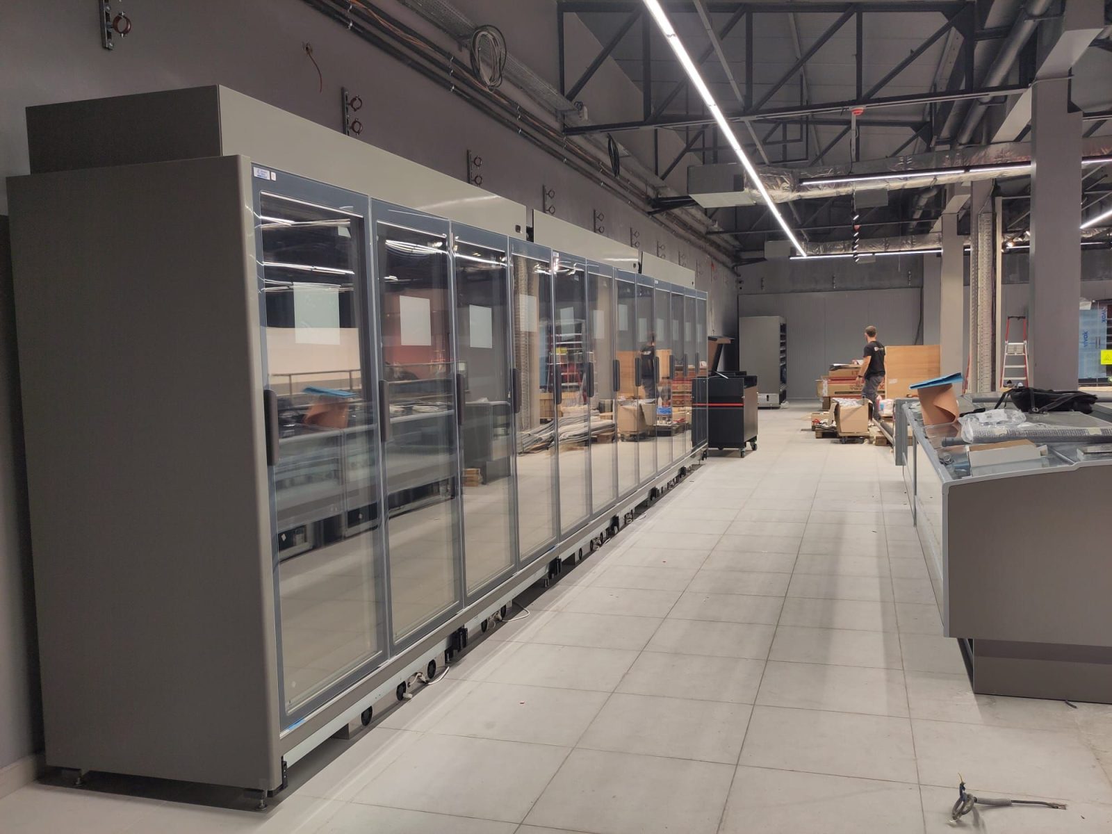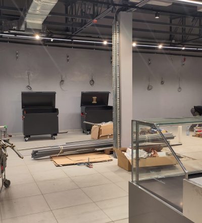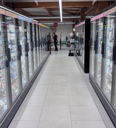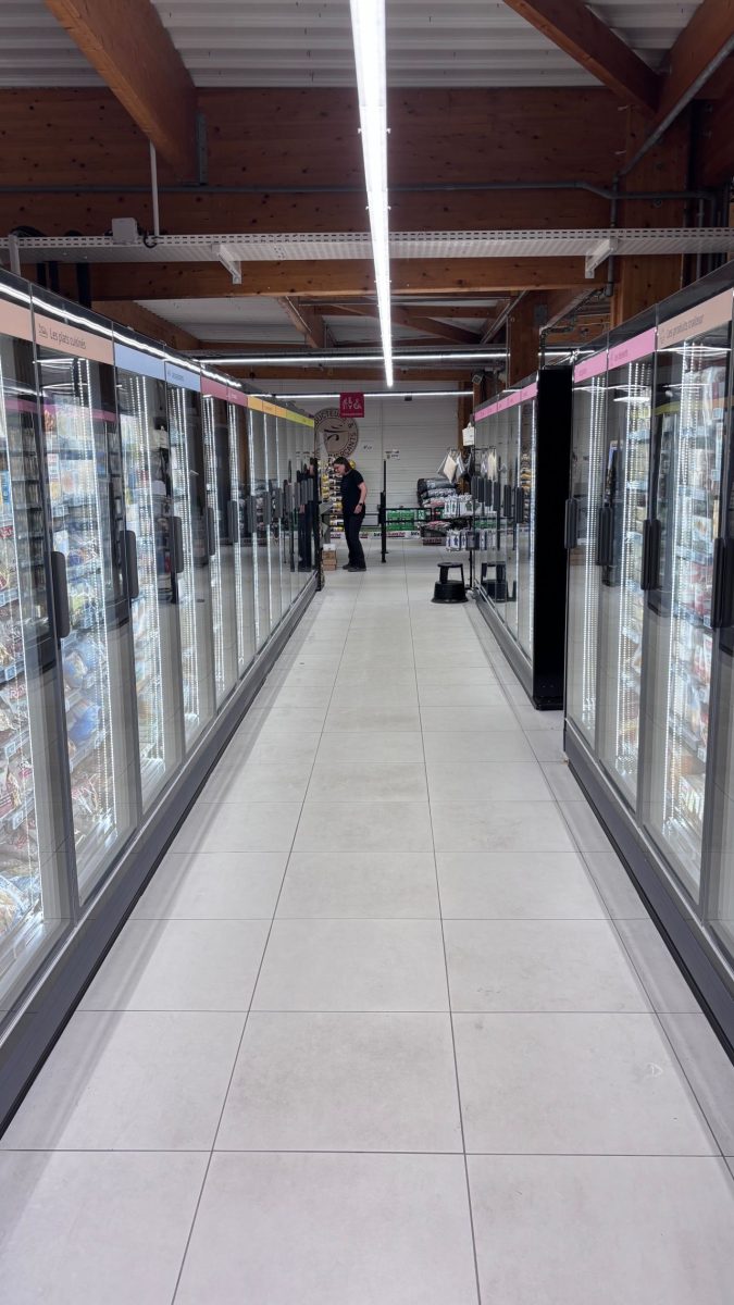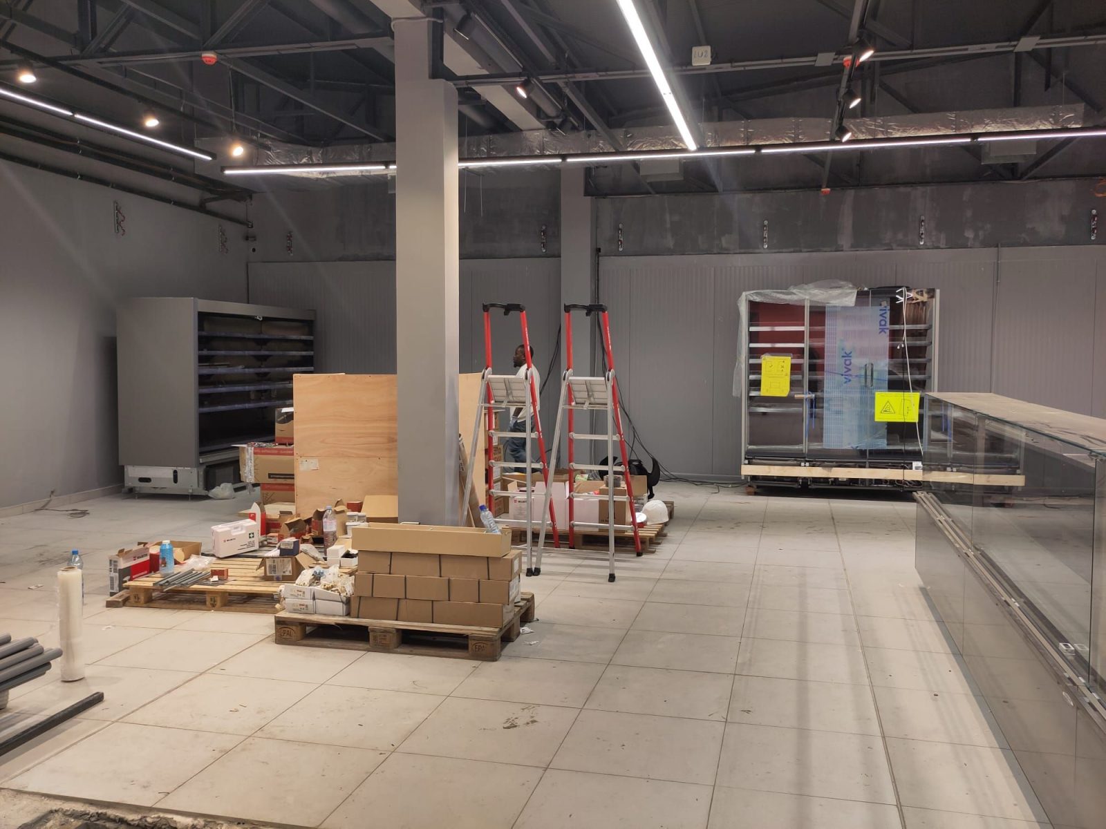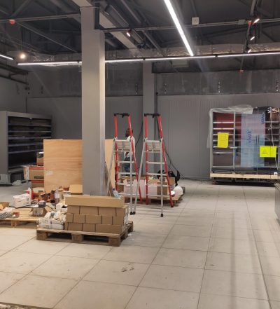 Après plusieurs semaines de chantier, les finitions avancent dans le magasin. La grande chambre froide est maintenant en service et les étagères commencent à se garnir des premières marchandises.